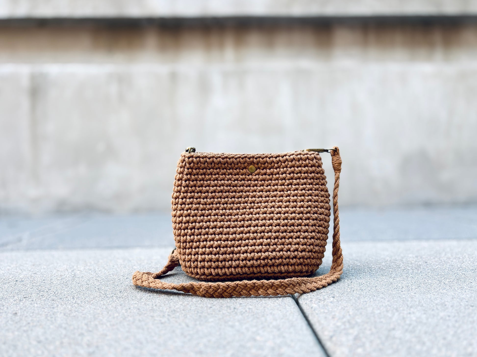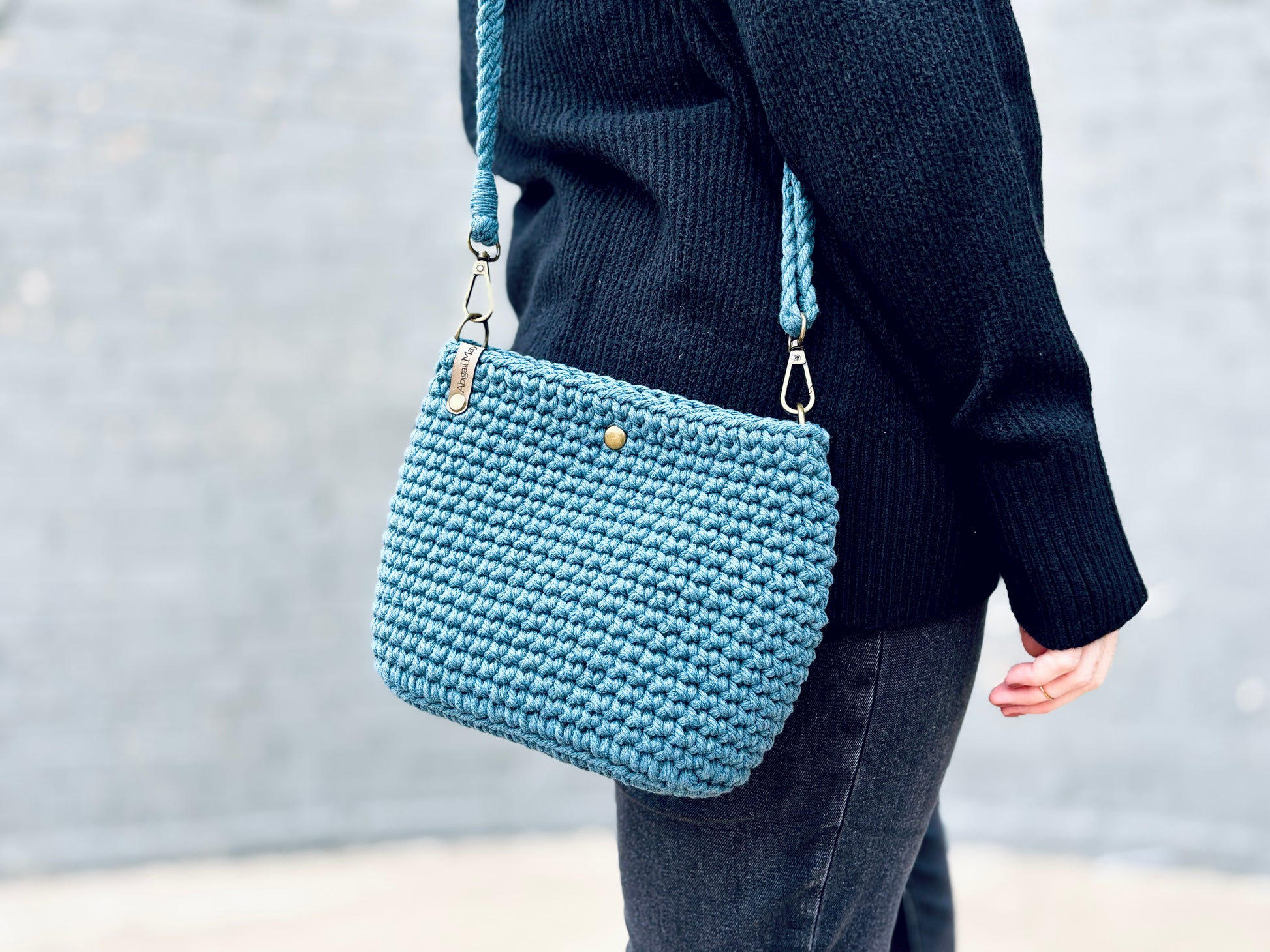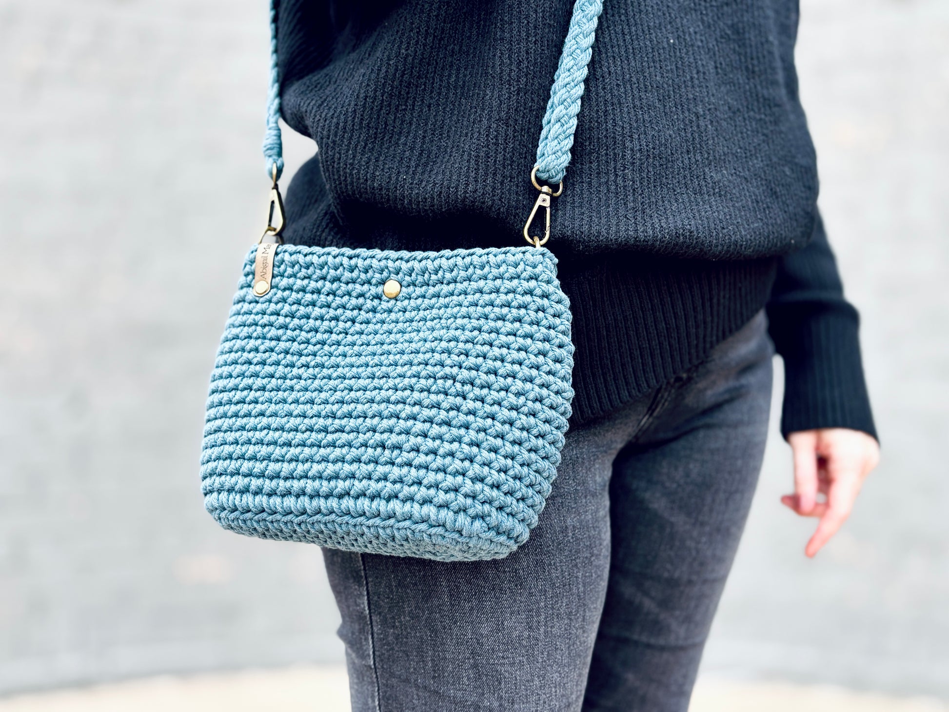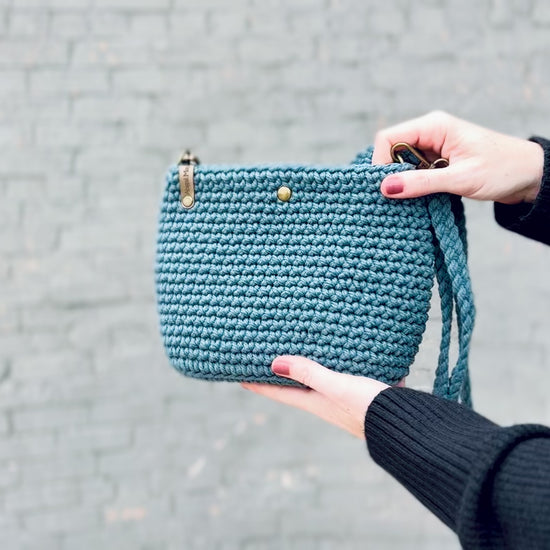 Crocheted from cotton cord. Features a removable, adjustable strap, magnetic snap closure, and stand-up base.