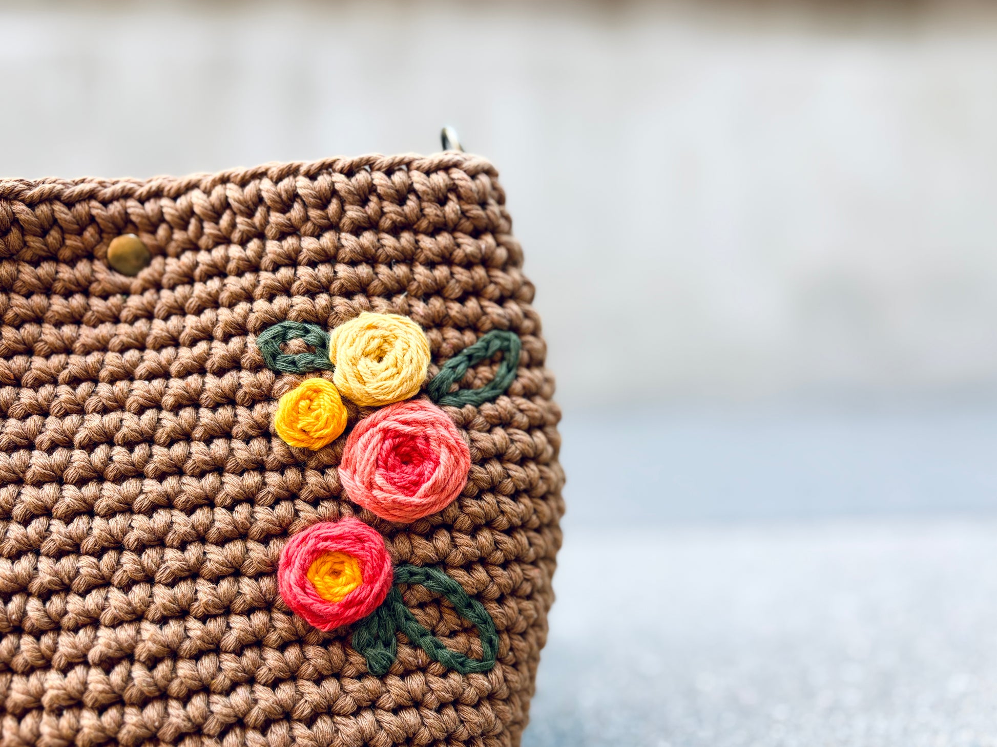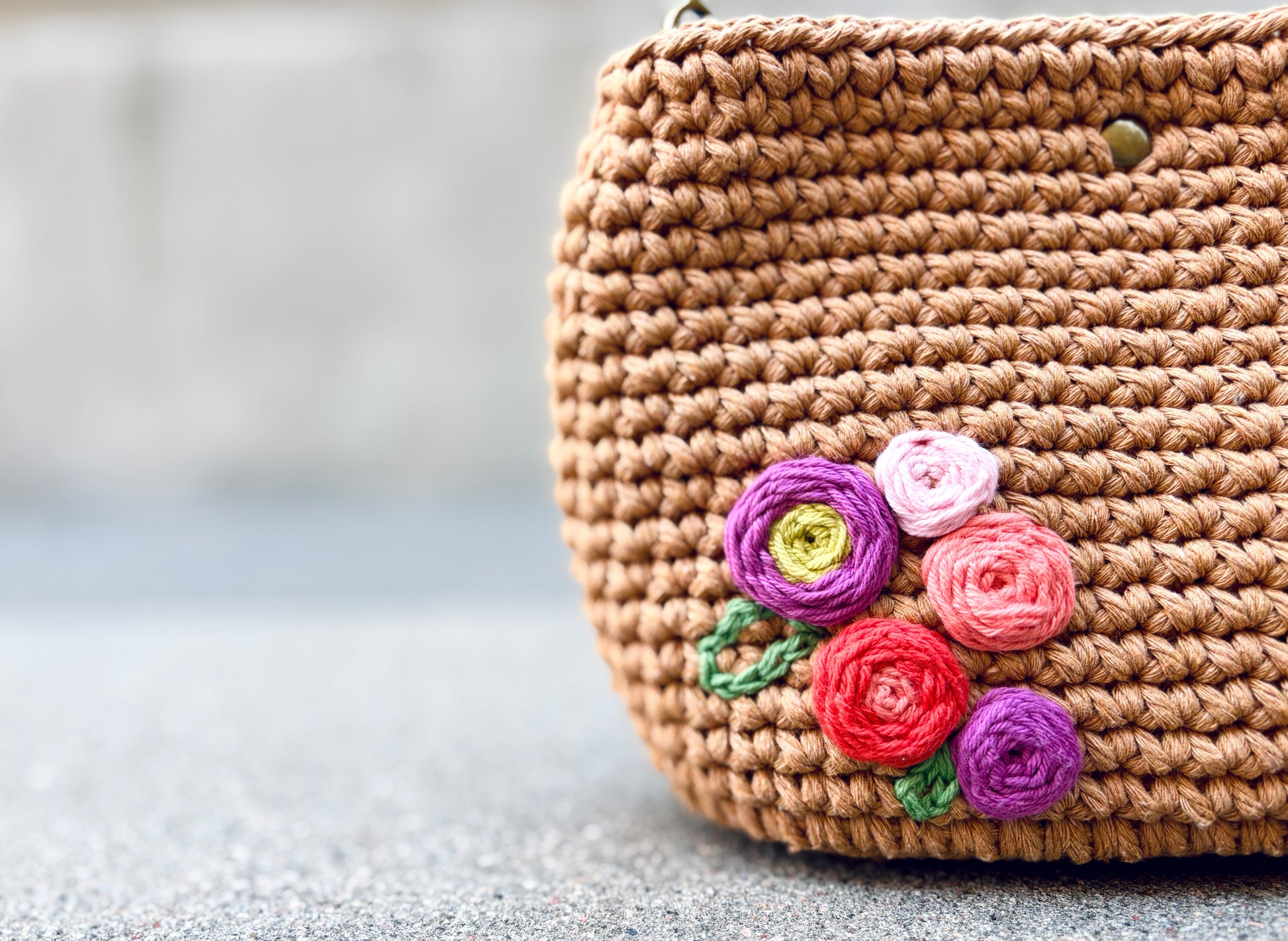 Crocheted from cotton cord. Features a removable, adjustable strap, magnetic snap closure, and stand-up base.