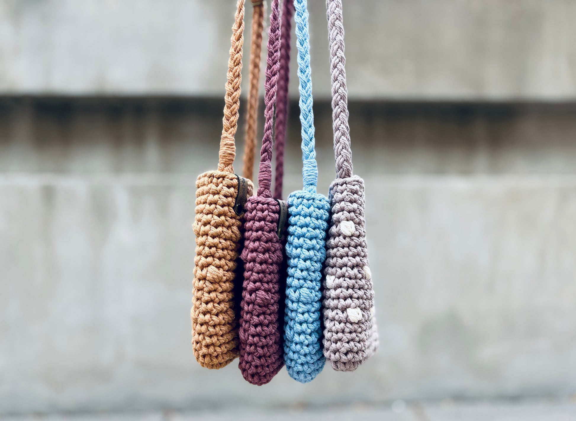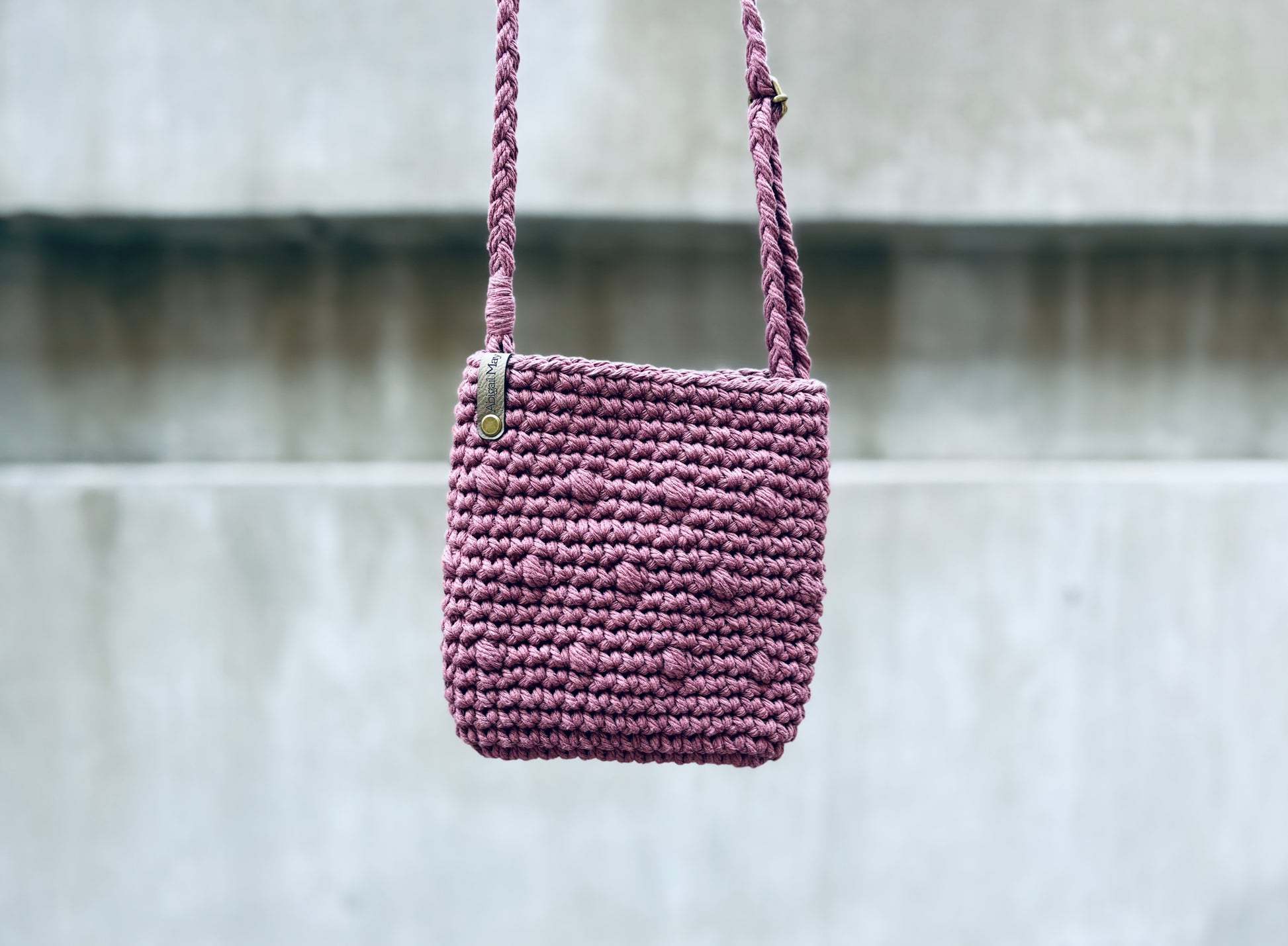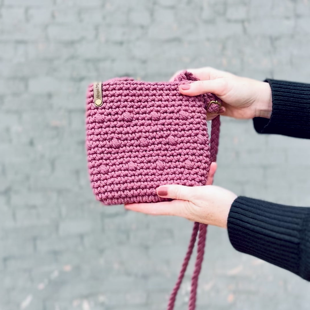 Crocheted from cotton cord. Features an adjustable strap.