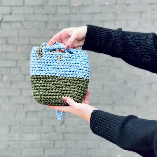 Crocheted from cotton cord. Features a removable, adjustable strap and magnetic snap closure.
