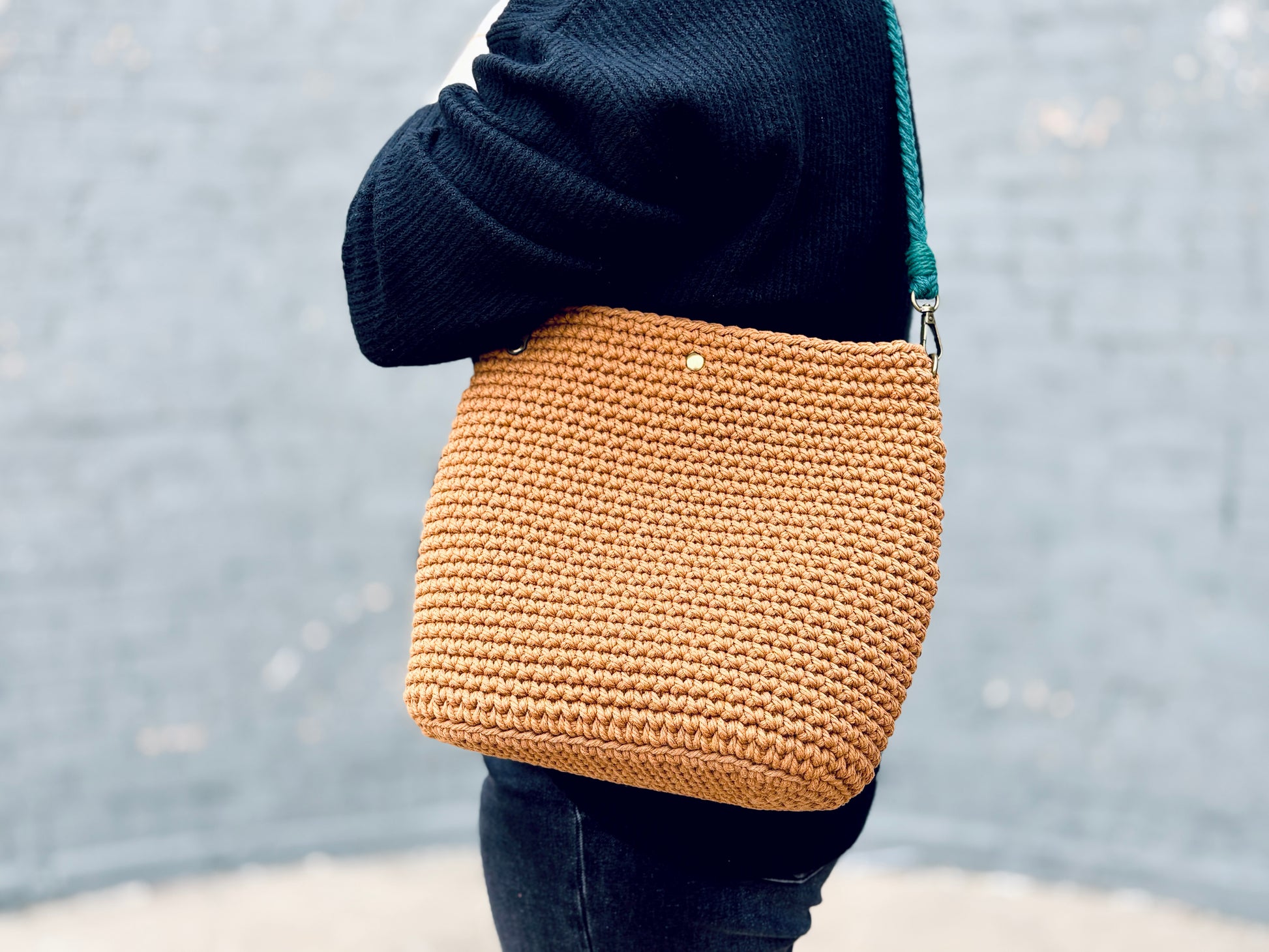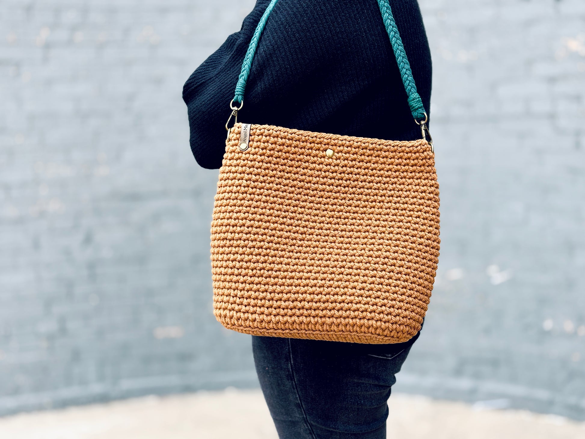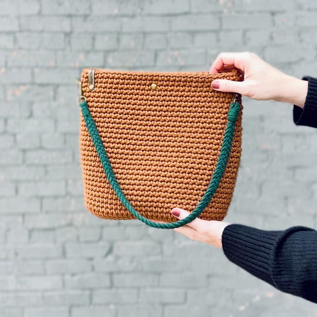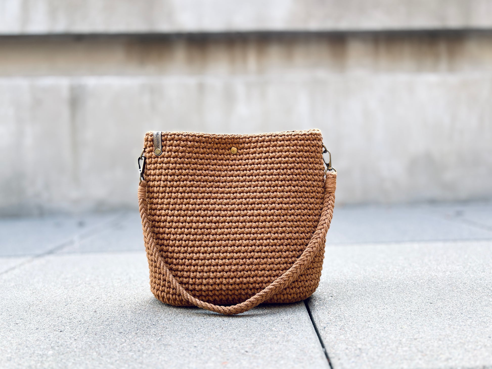 Crocheted from cotton cord. Features a removable shoulder strap, magnetic snap closure, and stand-up base.
