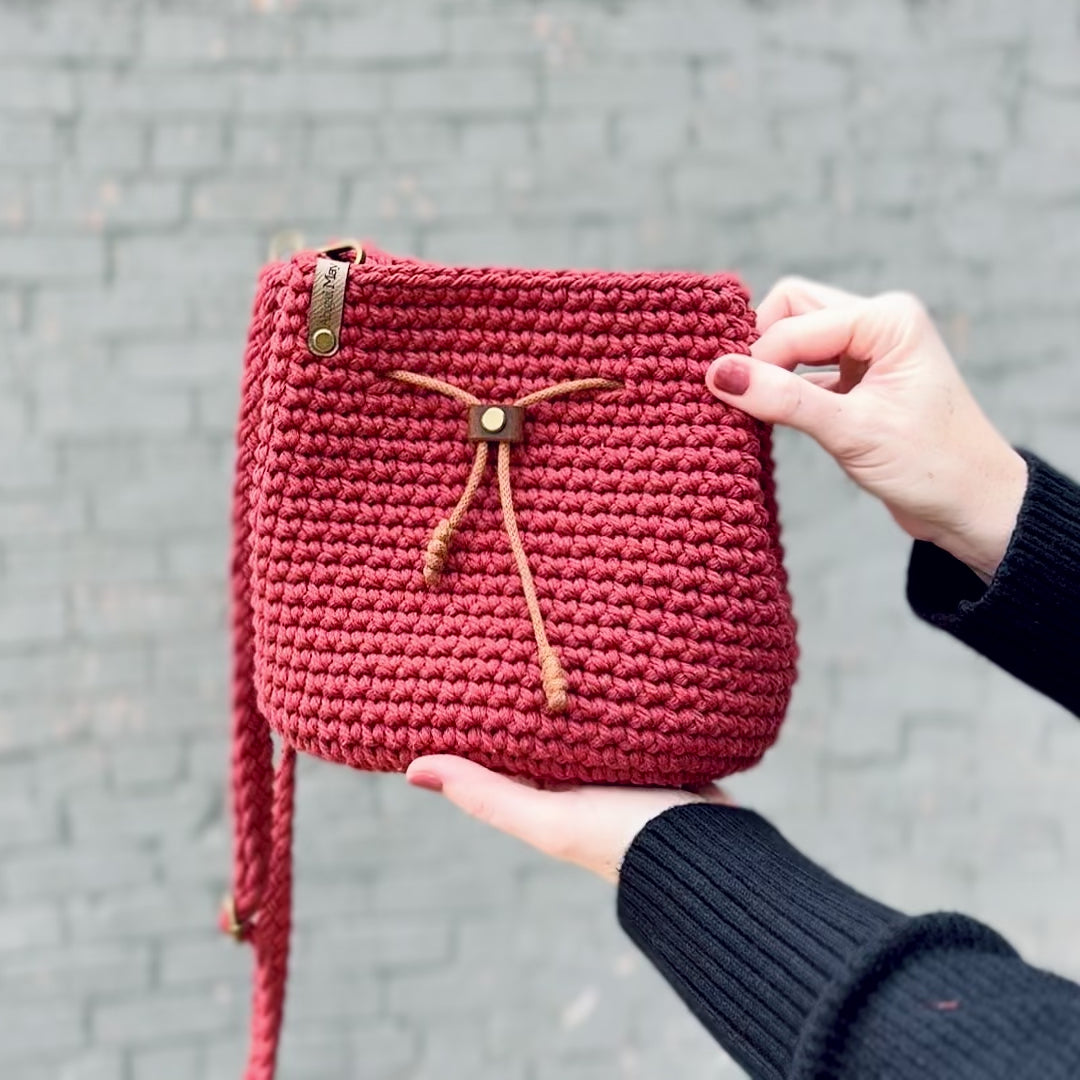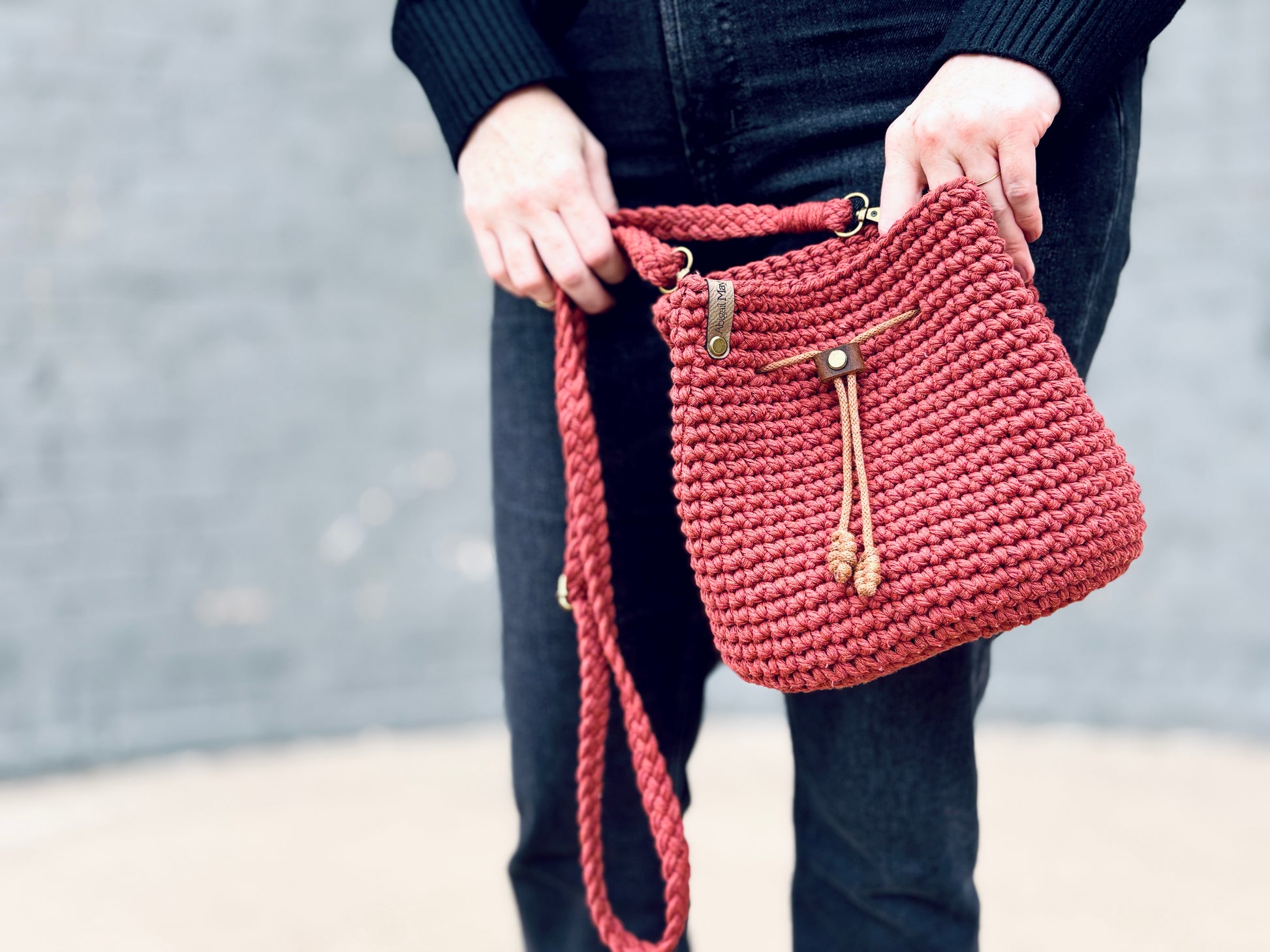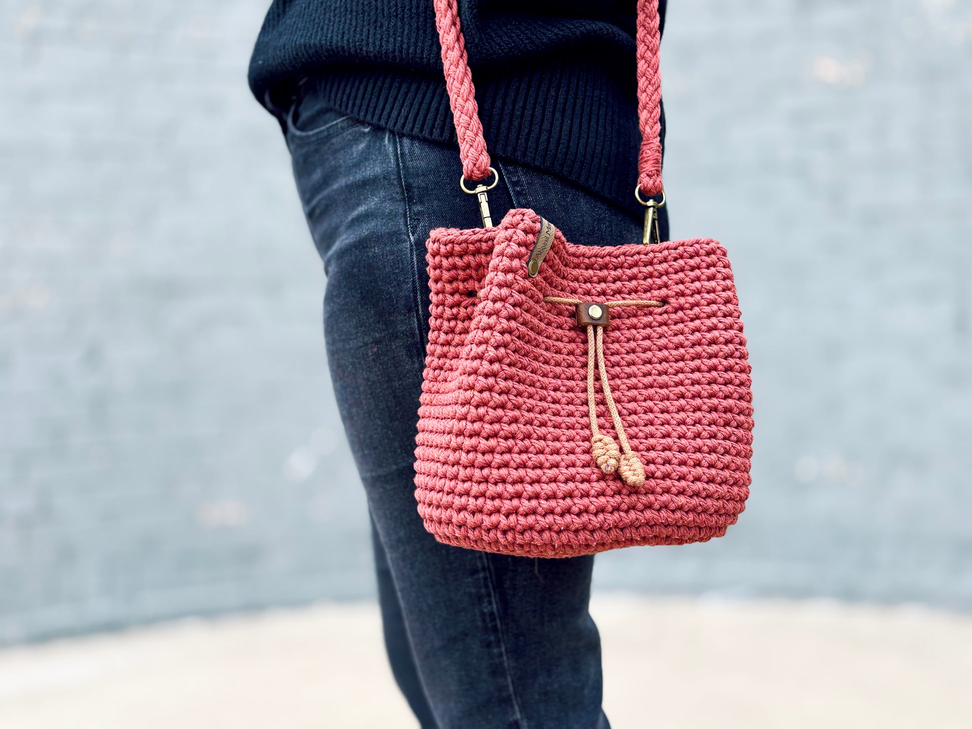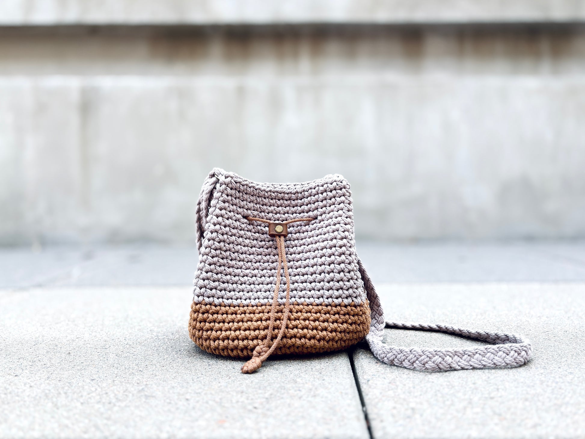 Crocheted from cotton cord. Features a removable, adjustable strap with swivel clasps. Drawstring closure with leather detail.