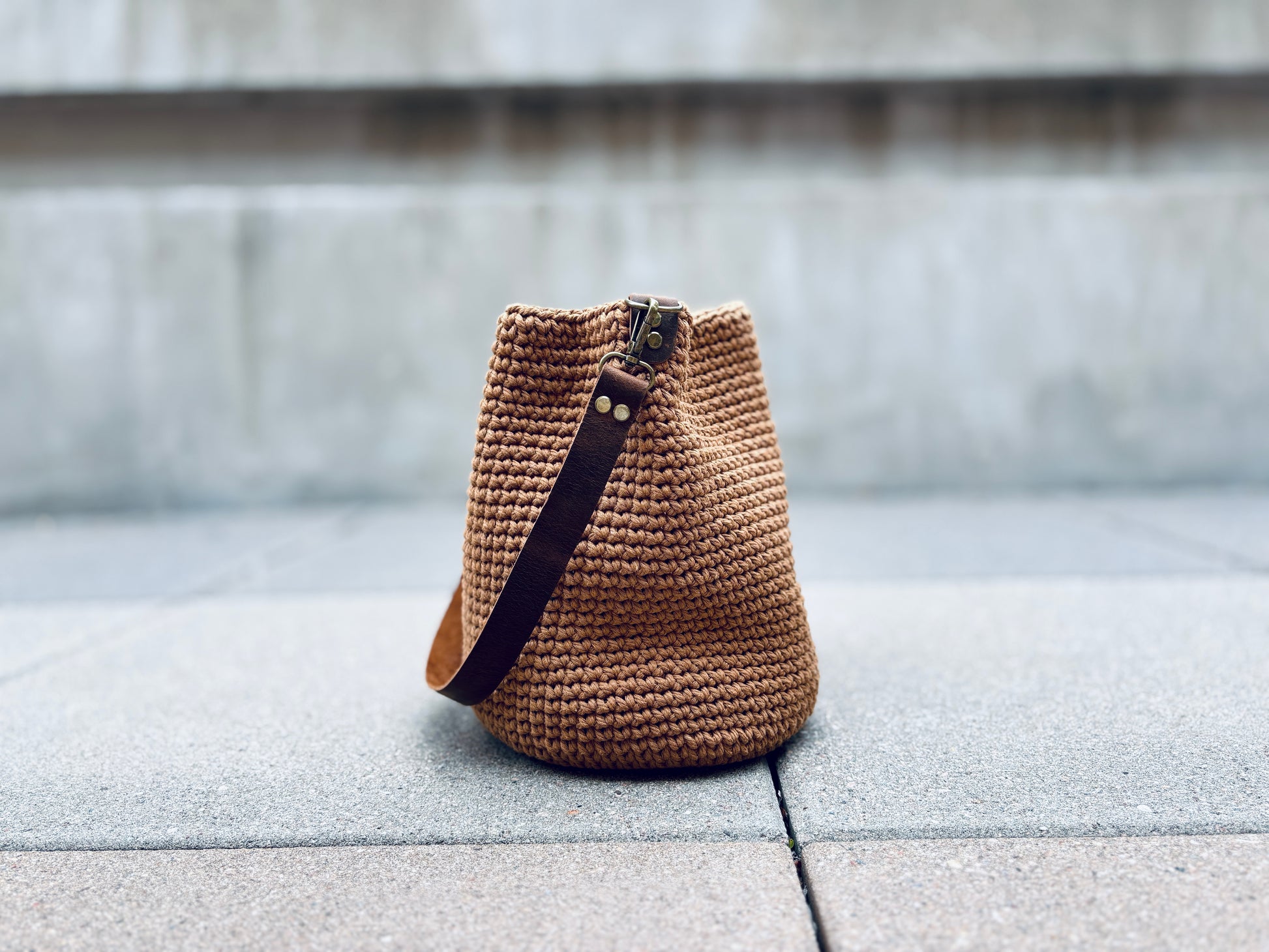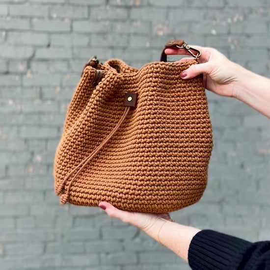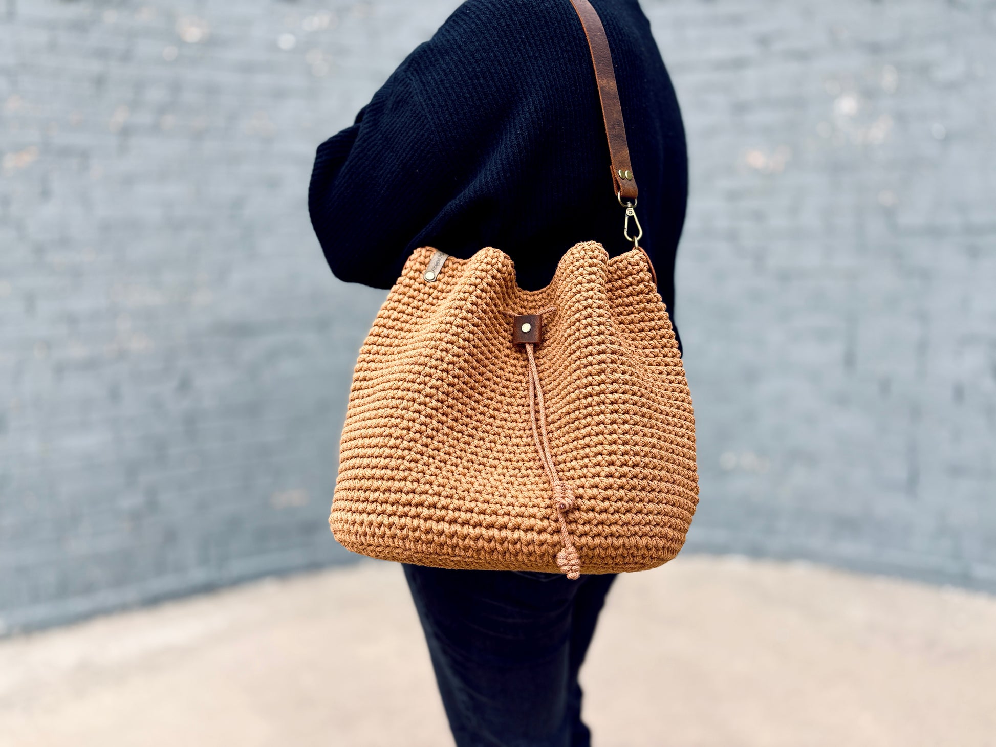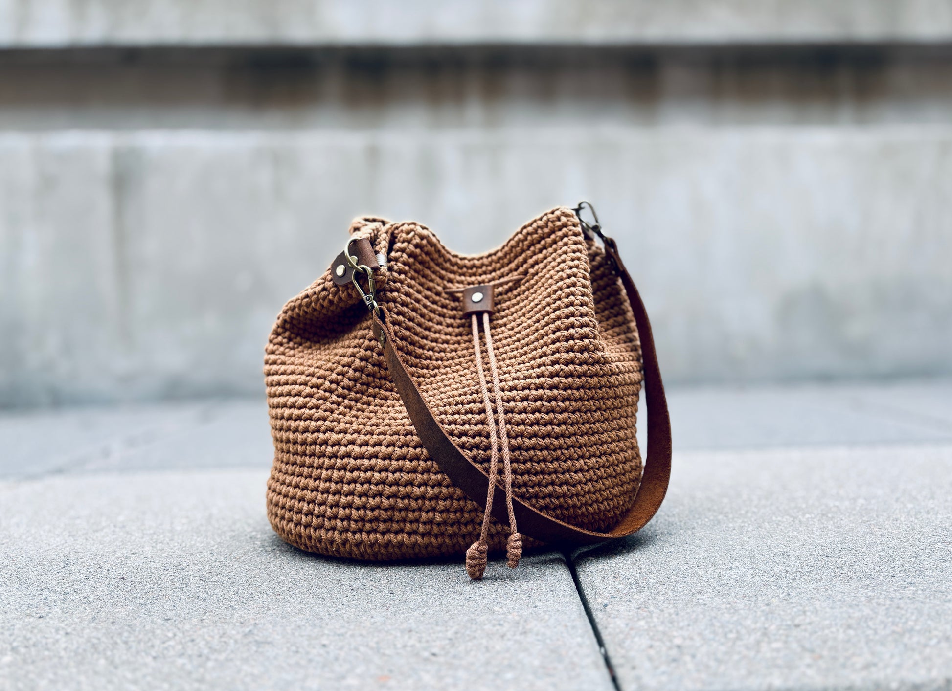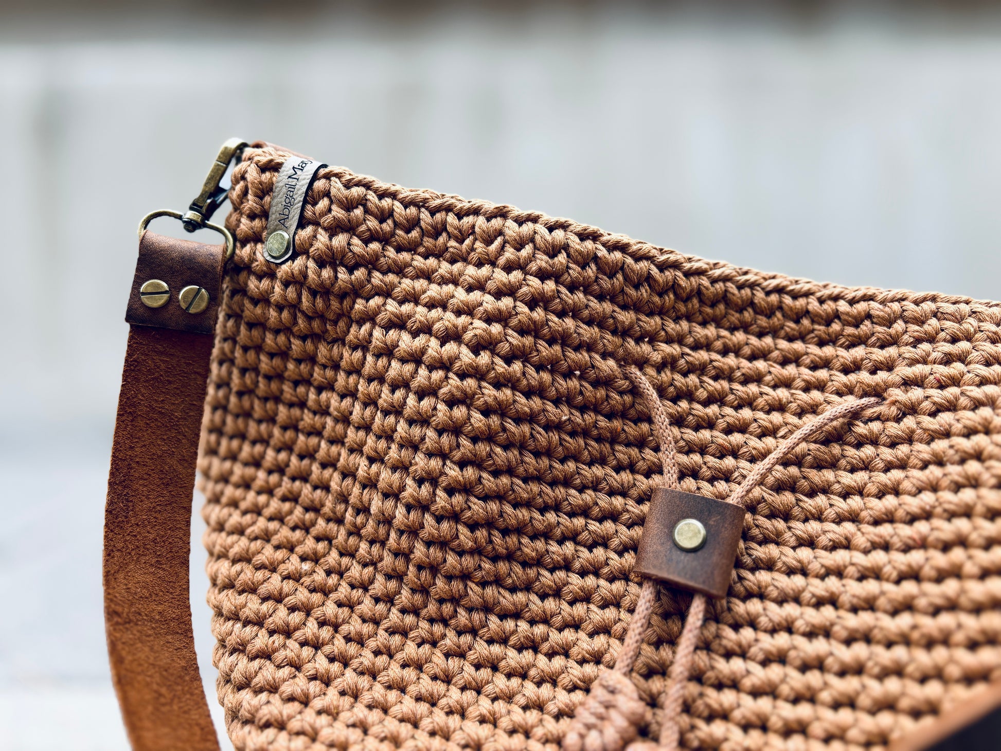 Crocheted from cotton cord. Features a leather strap and accents. Interior drawstring with leather detail.