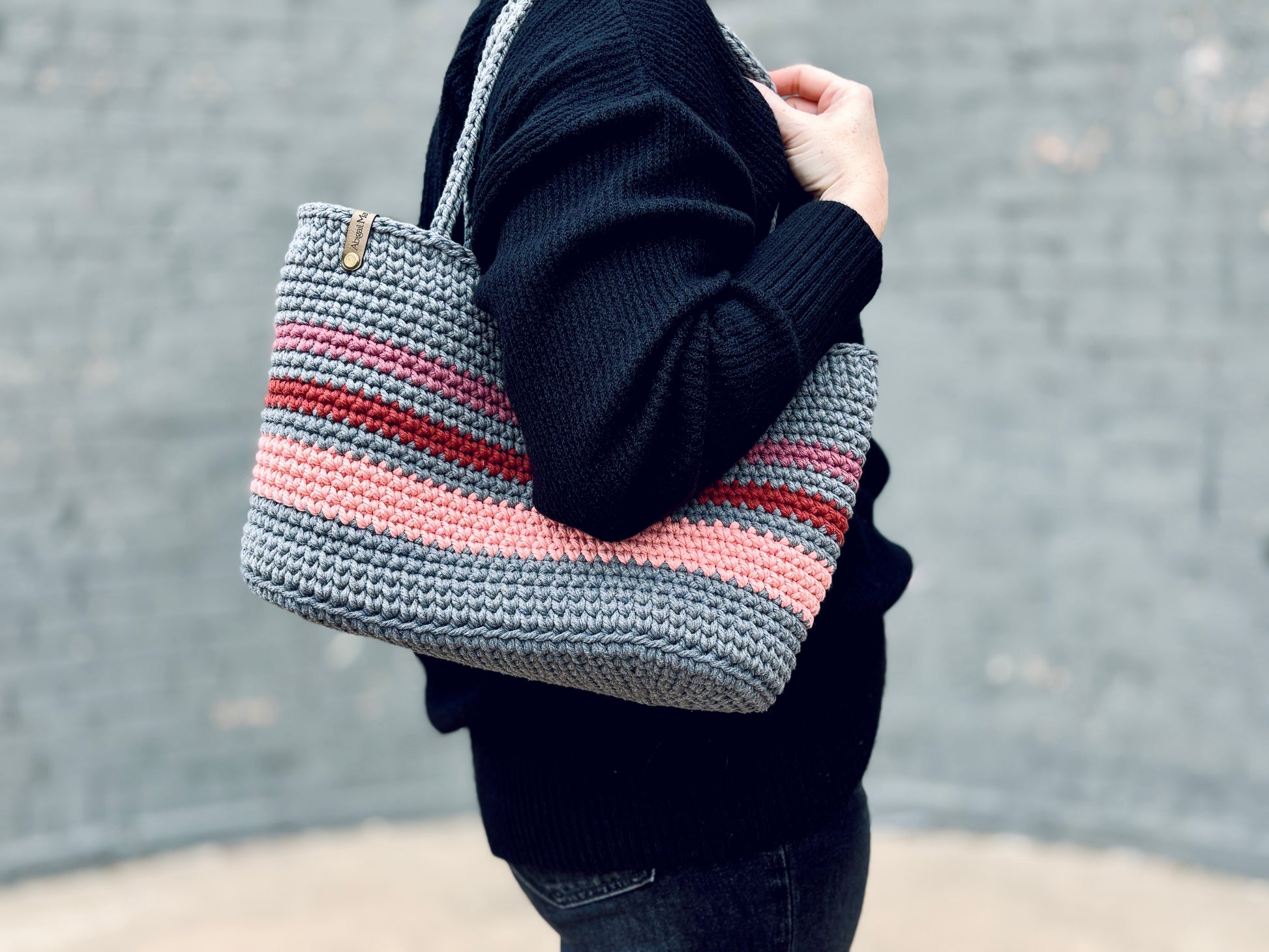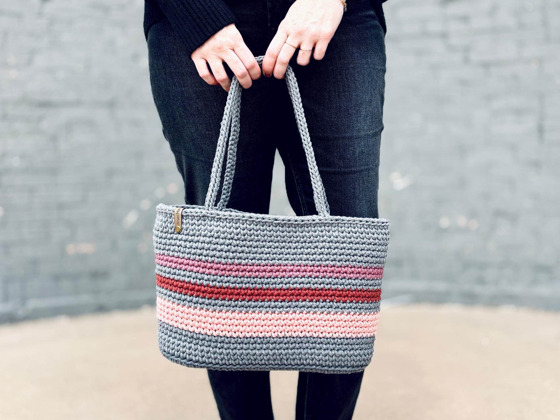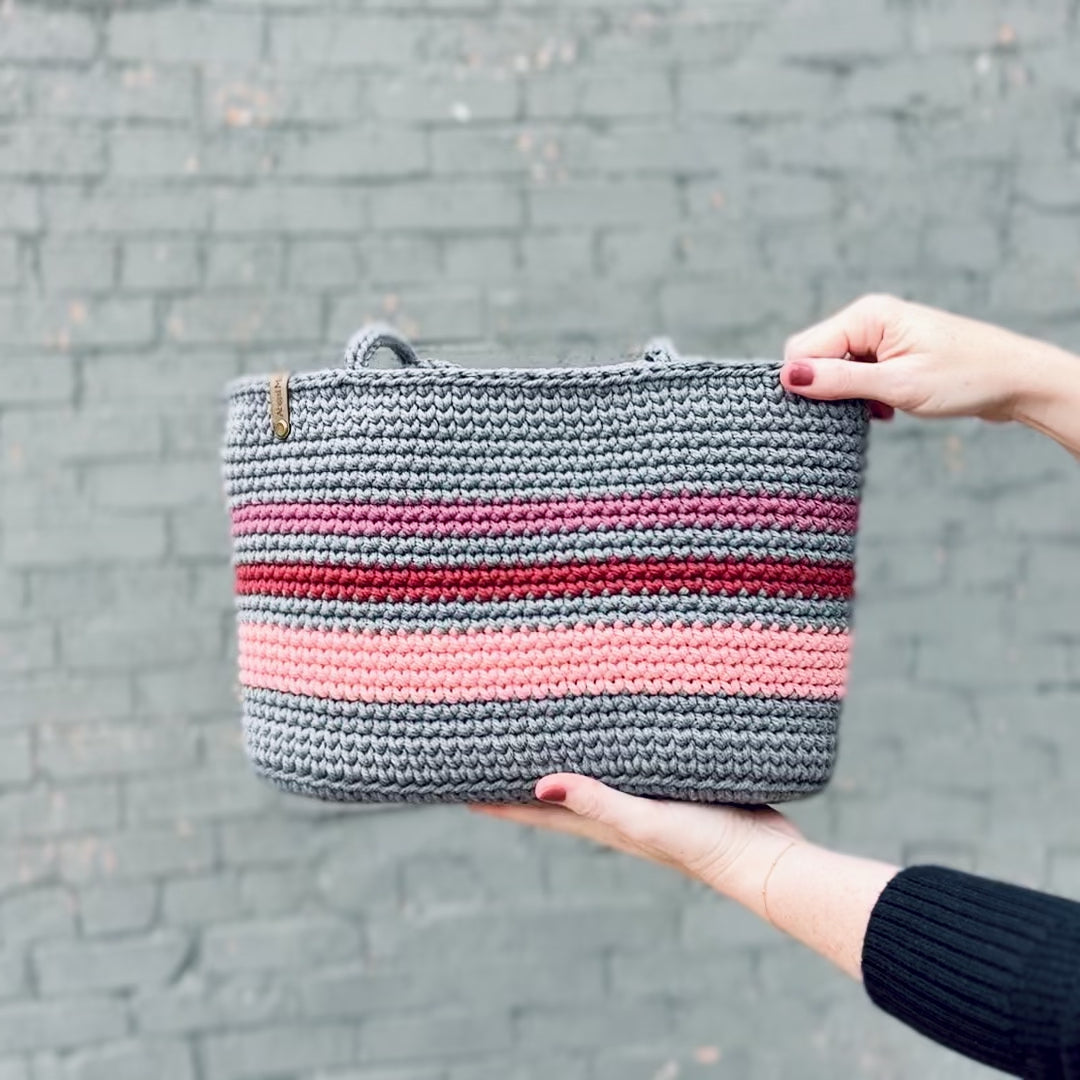 Crocheted from cotton cord. Features a stand-up base and shoulder straps.