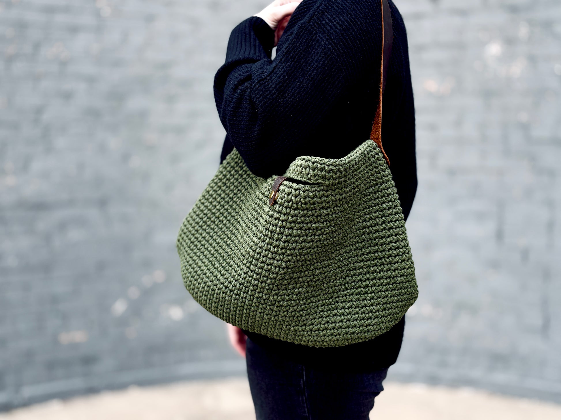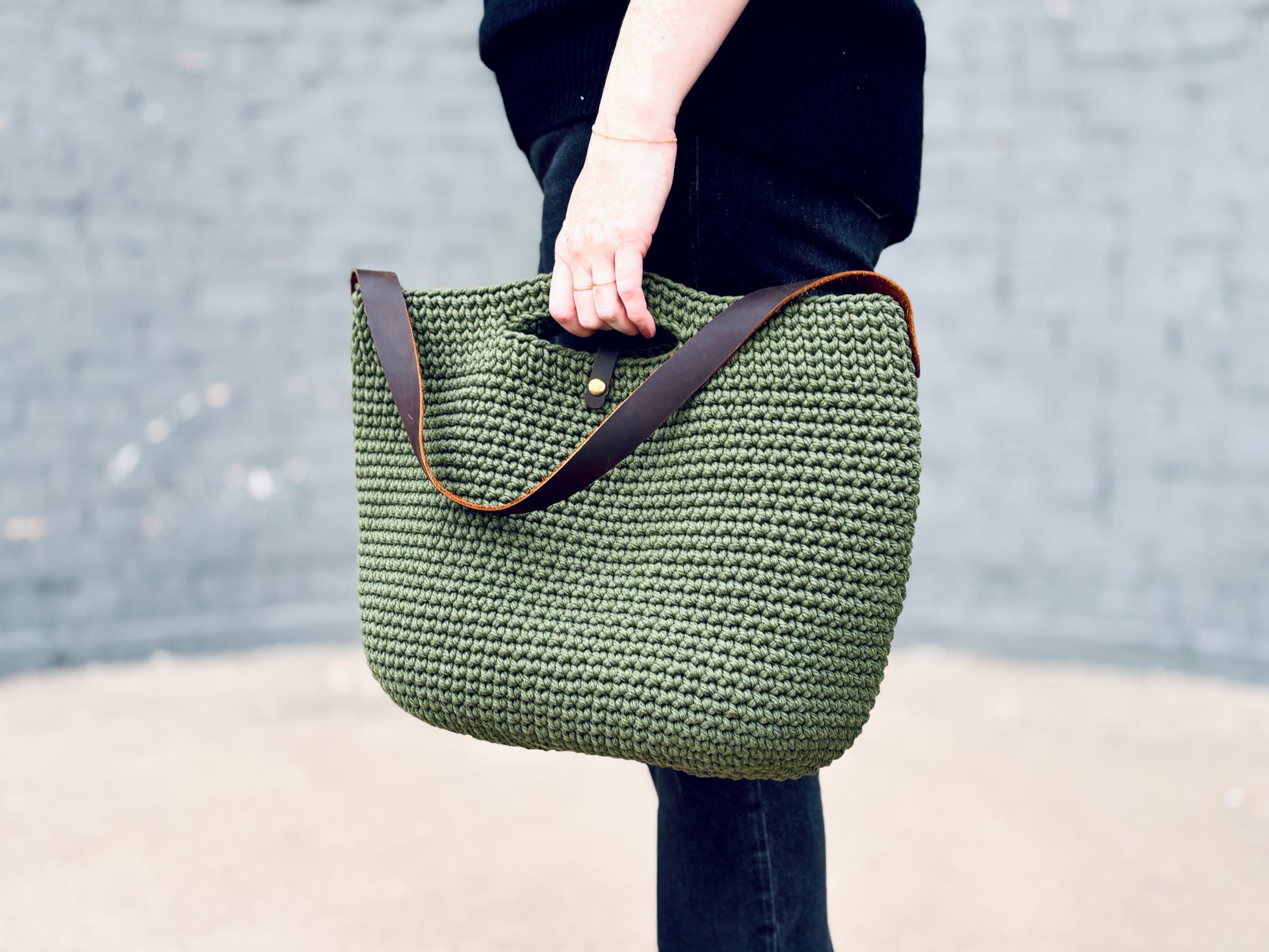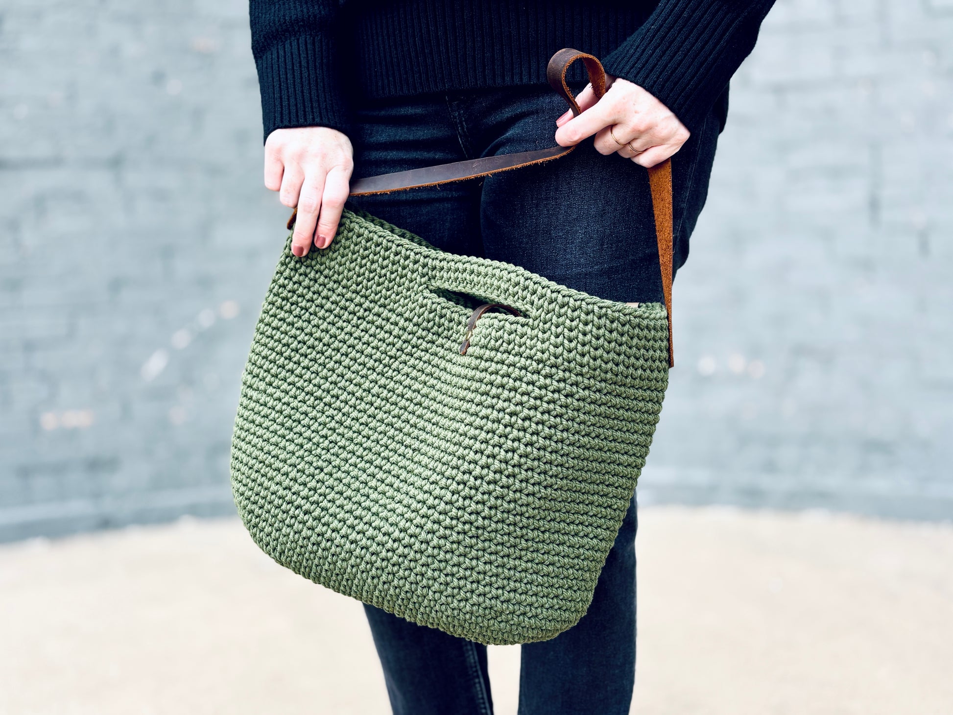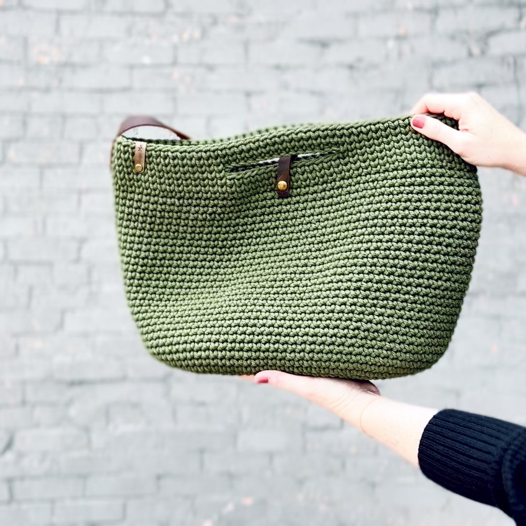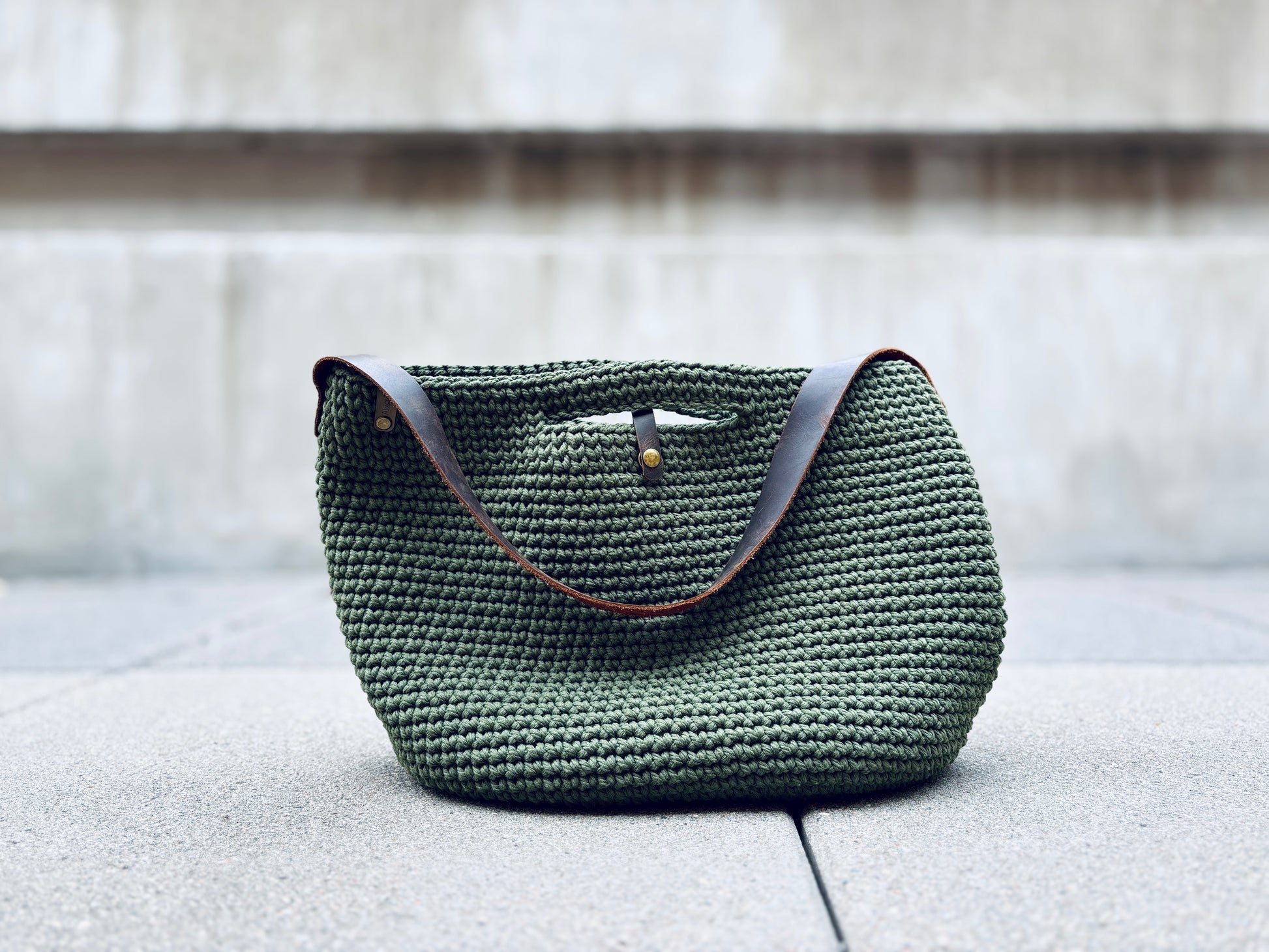 Crocheted from cotton cord. Features a leather strap and magnetic snap closure.